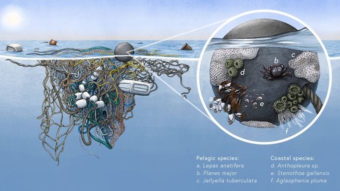 Людина ж щороку викидає у моря та океани сотні мільйонів тонн пластикового сміття, яке здатне плавати сотні чи тисячі років, перш ніж розпадеться повністю. Таке сміття може утворювати плаваючі острови для бактерій та дрібних морських рослин та тварин на зразок актиній та рачків. Щоб перевірити цю гіпотезу, американські екологи у різних місцях Тихого океану зібрали понад 100 тонн пластикового сміття та вивчили його у лабораторіях.